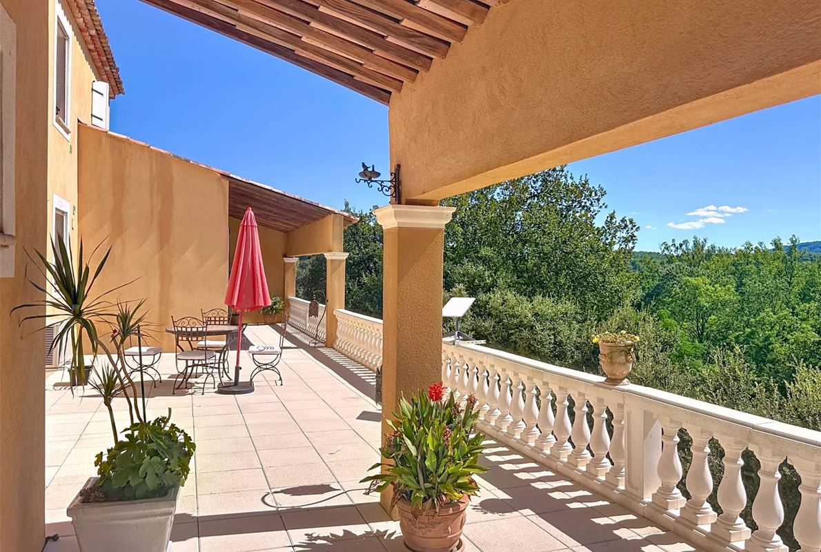 Just 5 km from thevillage of Lorgues. The property features an open kitchen and a bright living room that opens onto a large 70 m² terrace with stunning panoramic views. There are two comfortable bedrooms, each with its own private bathroom. In addition, there are four separate rooms with private bathrooms and private entrances, as well as two independent studios — perfect for quietly hosting family, friends, or other guests. A heated swimming pool (10 x 5 m) with sun terrace, pool house, and semi-professional outdoor kitchen Two jacuzzis, a sauna, and several relaxing seating areas scattered throughout the grounds A cozy room for relaxation or exercise Private access to the river with a pontoon and canoes