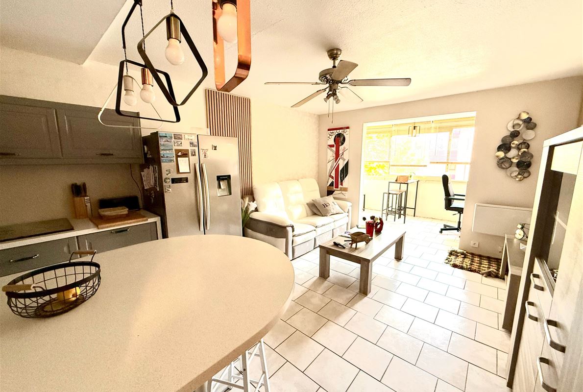 In a gated community close to major roads and the center of Fréjus, in a quiet location, this 60.65 sq m (650 sq ft) 2-bedroom apartment is located on the 1st floor. It comprises an entrance hall with a cloakroom, a fully equipped kitchen opening onto the living room, two bedrooms (one with a dressing room), a shower room with a window, and a separate WC. A cellar is included. Free parking is available within the community.