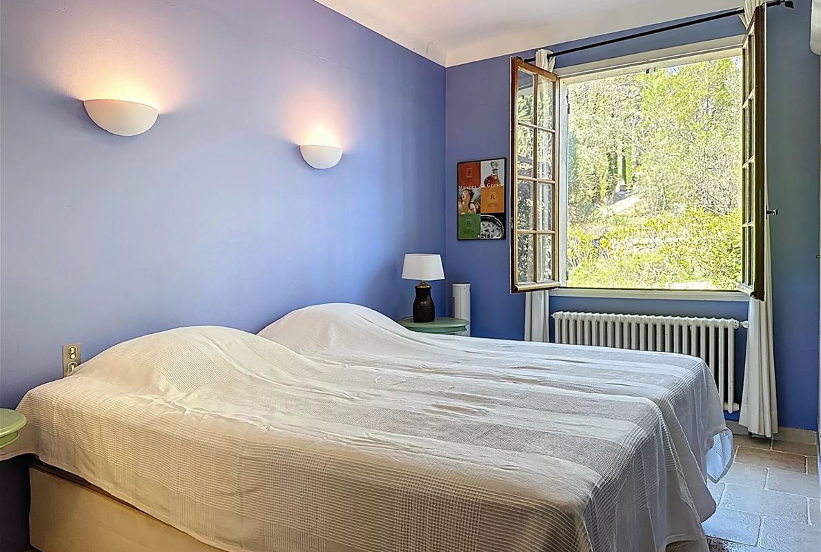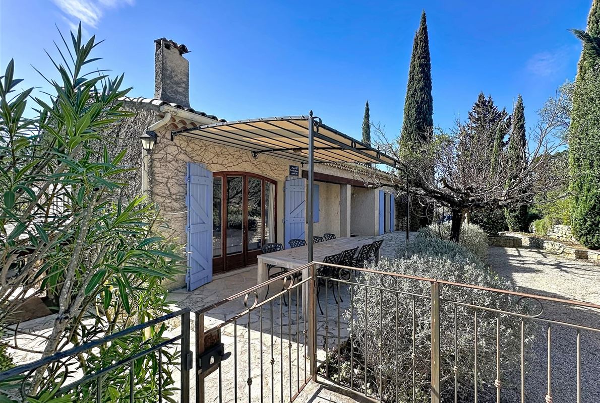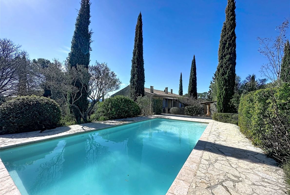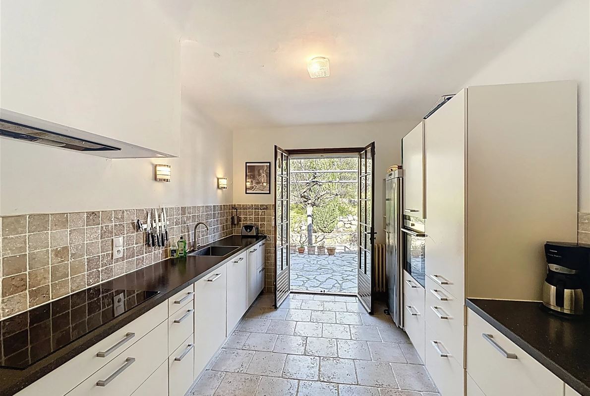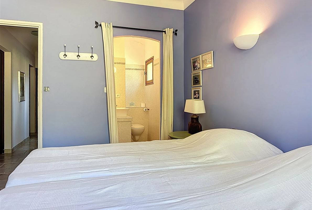 a few kilometers from the village, this charming villa offers breathtaking views. The house includes a kitchen and a bright, very nice living/dining area . The large master suite boasts a beautiful bathroom, separate toilet,. The other bedrooms are located on the opposite side of the living area: one bedroom with its own bathroom and two additional bedrooms, one of which has French doors opening onto the covered terrace. These bedrooms share a bathroom and a separate toilet. Beneath the entire house is a basement with a garage, ample storage space, and two additional bedrooms with windows and a bathroom. The surrounding garden is beautifully maintained with Mediterranean plants. The 11 x 5 meter pool is in excellent condition.