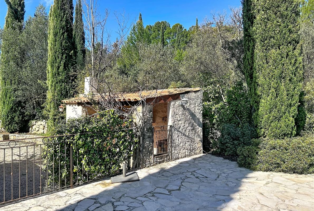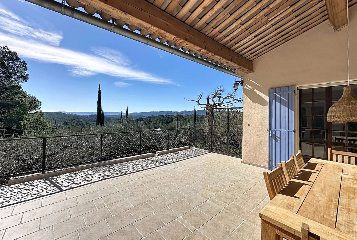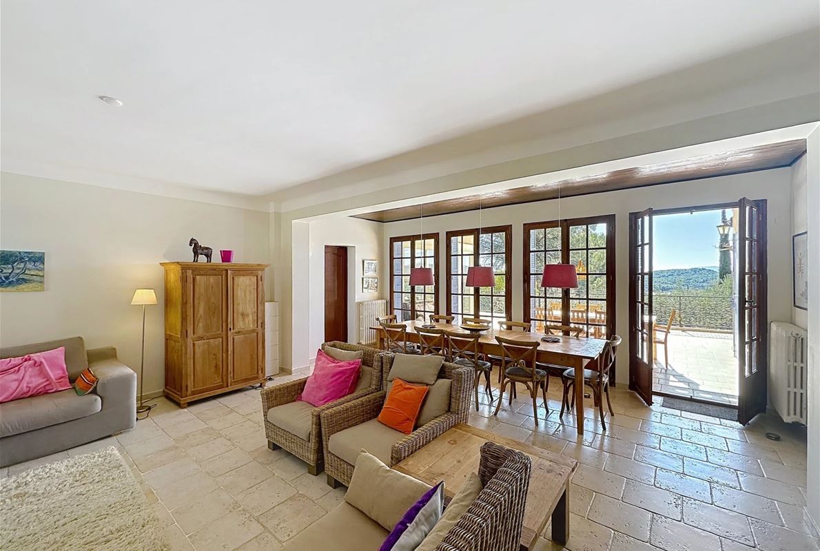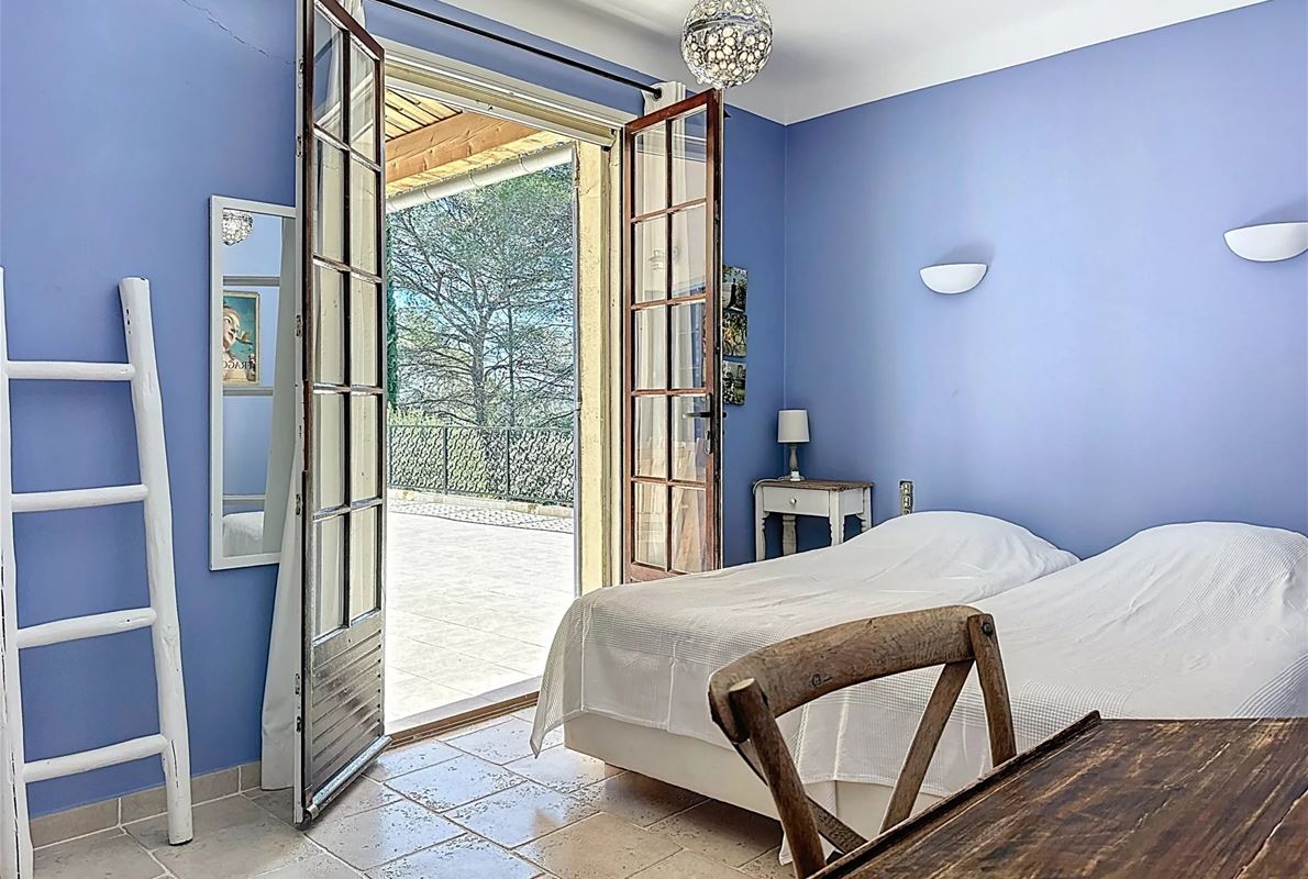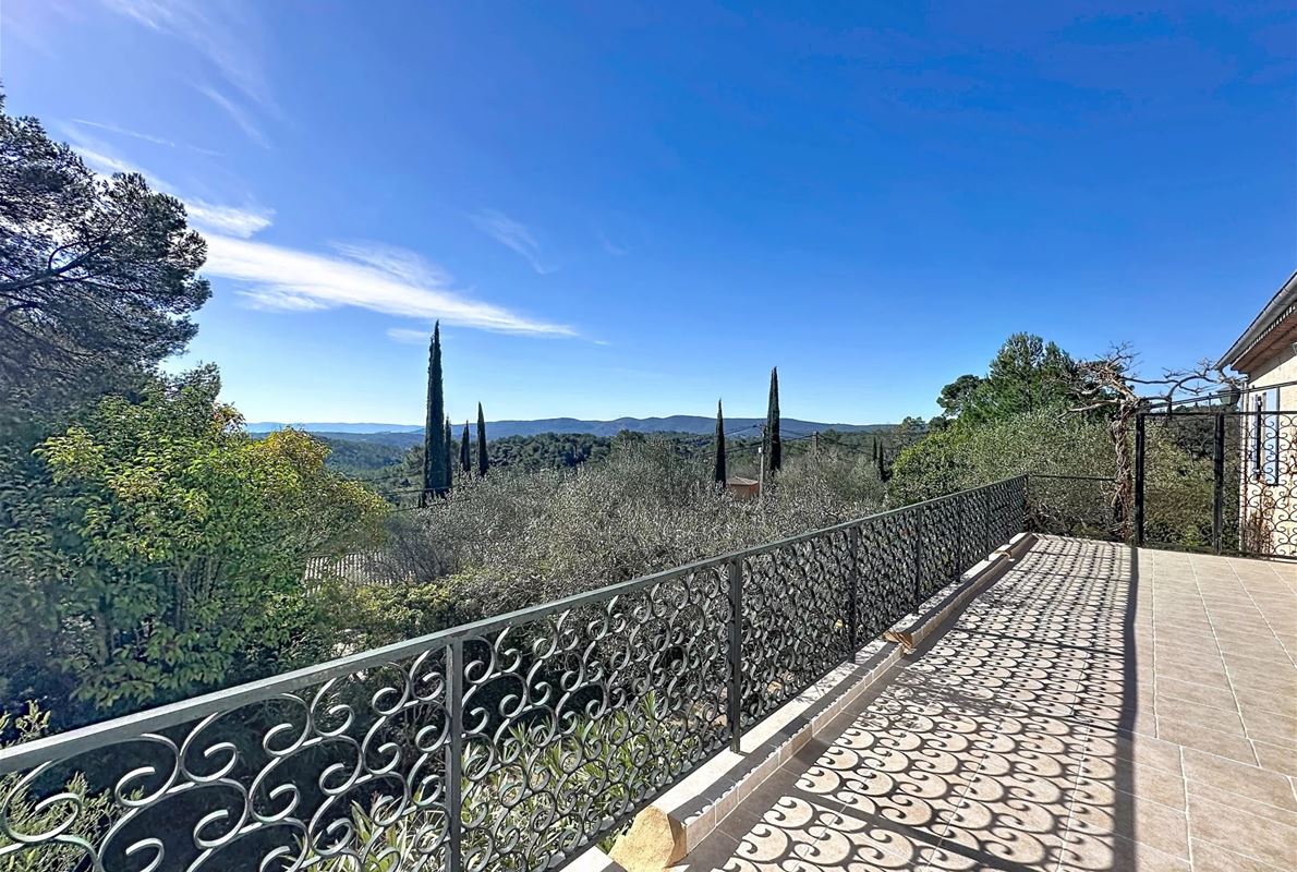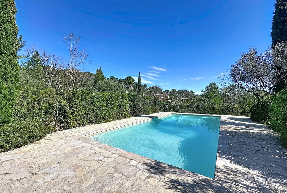 a few kilometers from the village, this charming villa offers breathtaking views. The house includes a kitchen and a bright, very nice living/dining area . The large master suite boasts a beautiful bathroom, separate toilet,. The other bedrooms are located on the opposite side of the living area: one bedroom with its own bathroom and two additional bedrooms, one of which has French doors opening onto the covered terrace. These bedrooms share a bathroom and a separate toilet. Beneath the entire house is a basement with a garage, ample storage space, and two additional bedrooms with windows and a bathroom. The surrounding garden is beautifully maintained with Mediterranean plants. The 11 x 5 meter pool is in excellent condition.