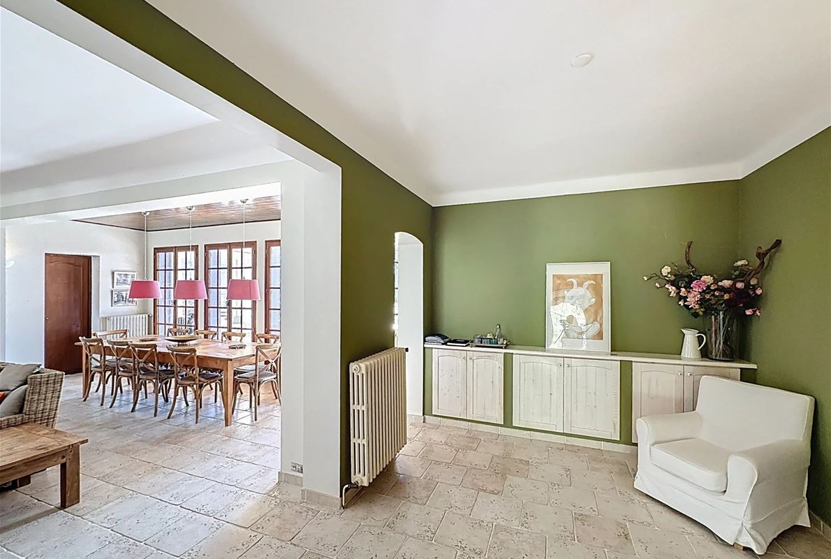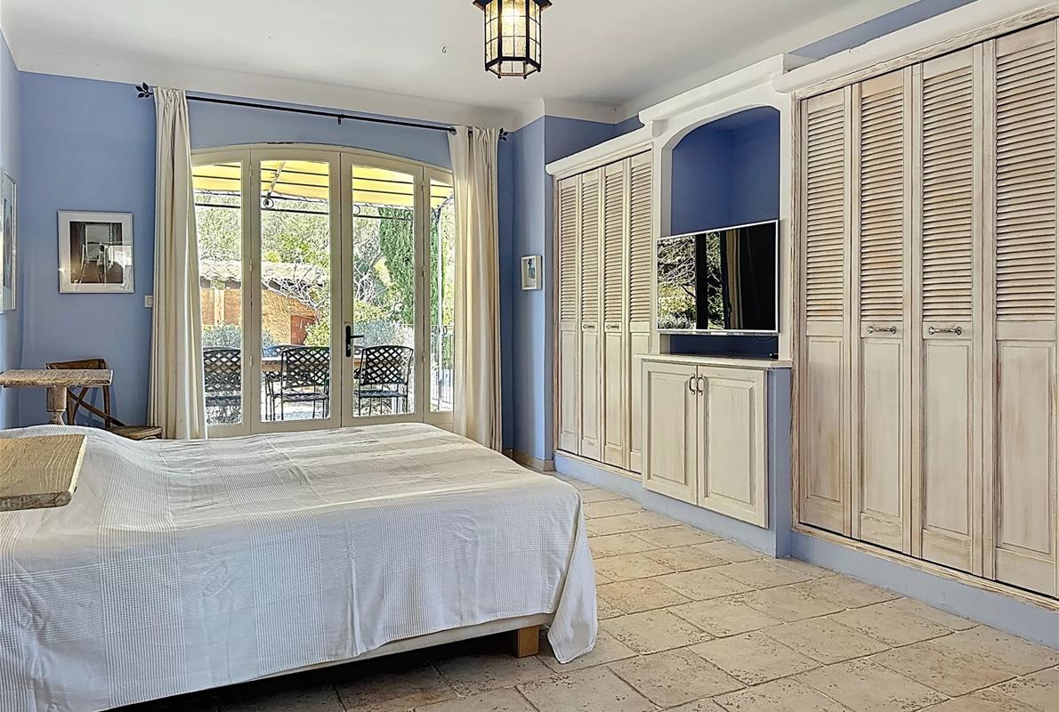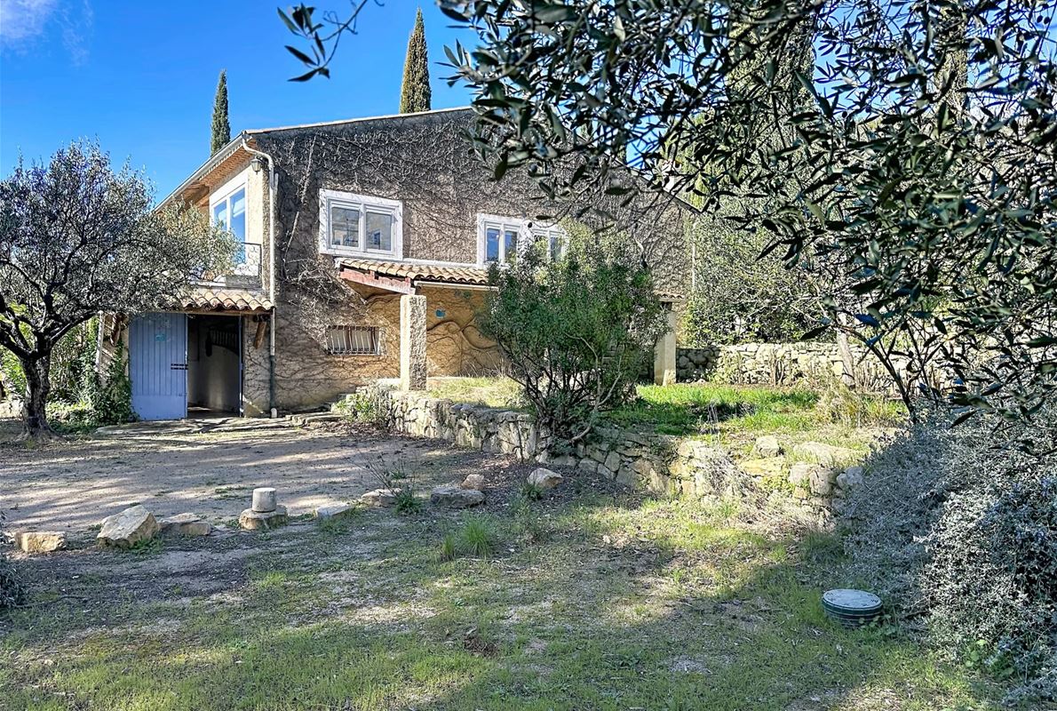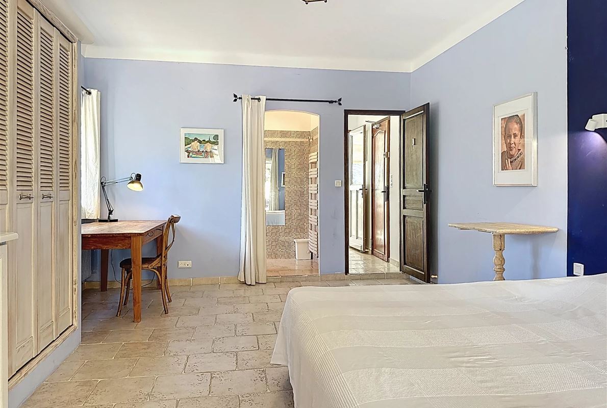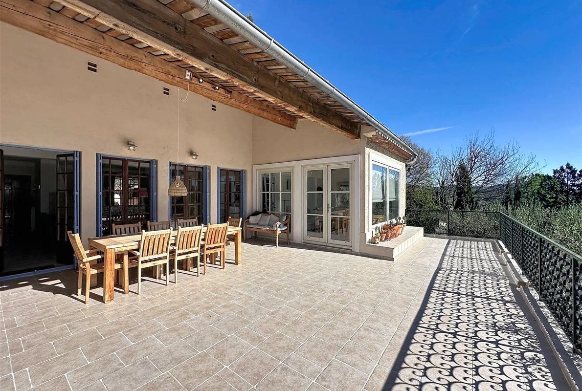 a few kilometers from the village, this charming villa offers breathtaking views. The house includes a kitchen and a bright, very nice living/dining area . The large master suite boasts a beautiful bathroom, separate toilet,. The other bedrooms are located on the opposite side of the living area: one bedroom with its own bathroom and two additional bedrooms, one of which has French doors opening onto the covered terrace. These bedrooms share a bathroom and a separate toilet. Beneath the entire house is a basement with a garage, ample storage space, and two additional bedrooms with windows and a bathroom. The surrounding garden is beautifully maintained with Mediterranean plants. The 11 x 5 meter pool is in excellent condition.