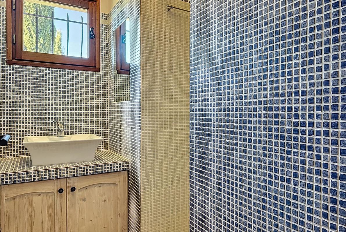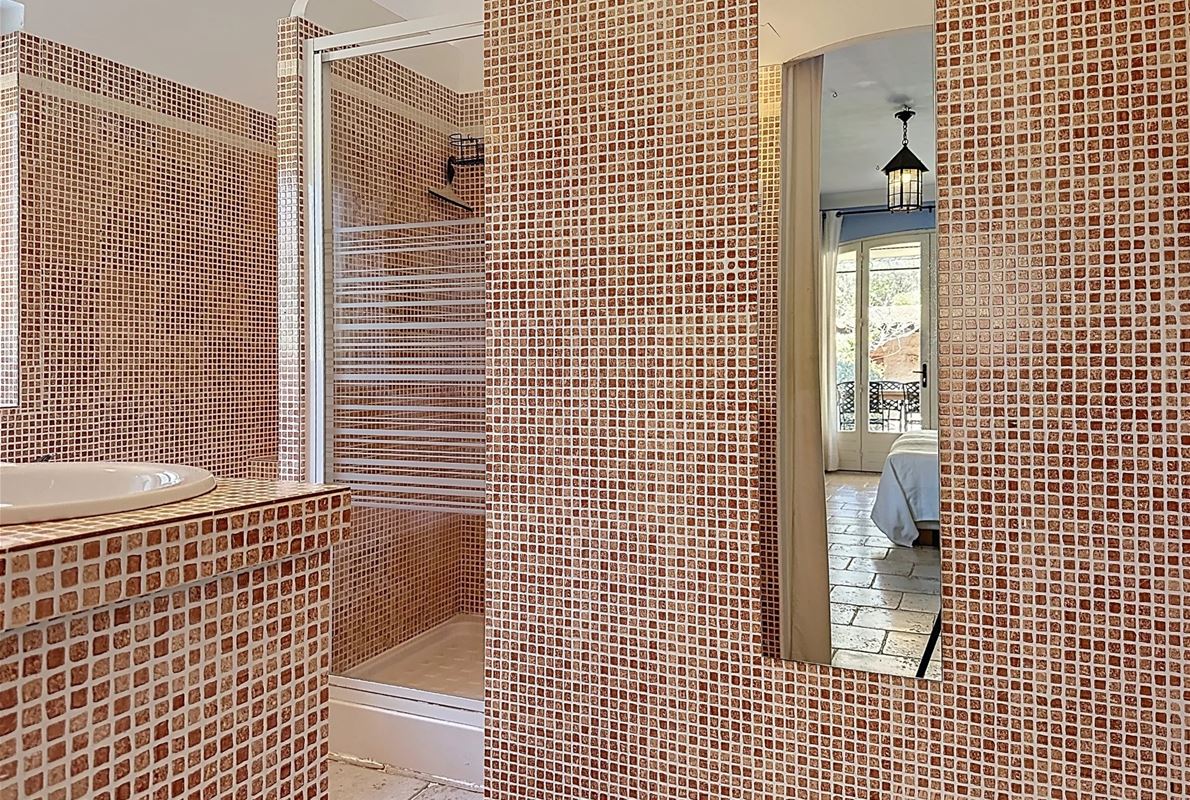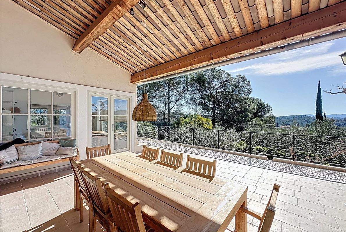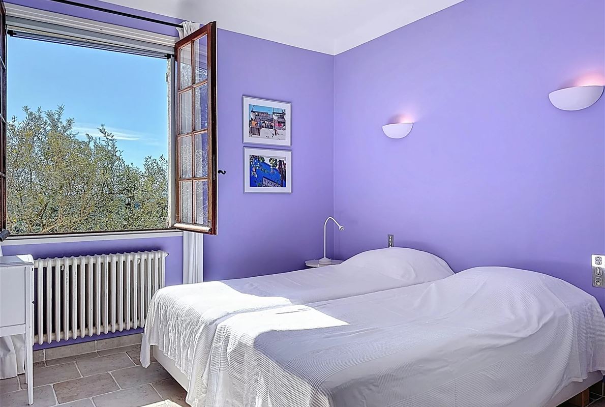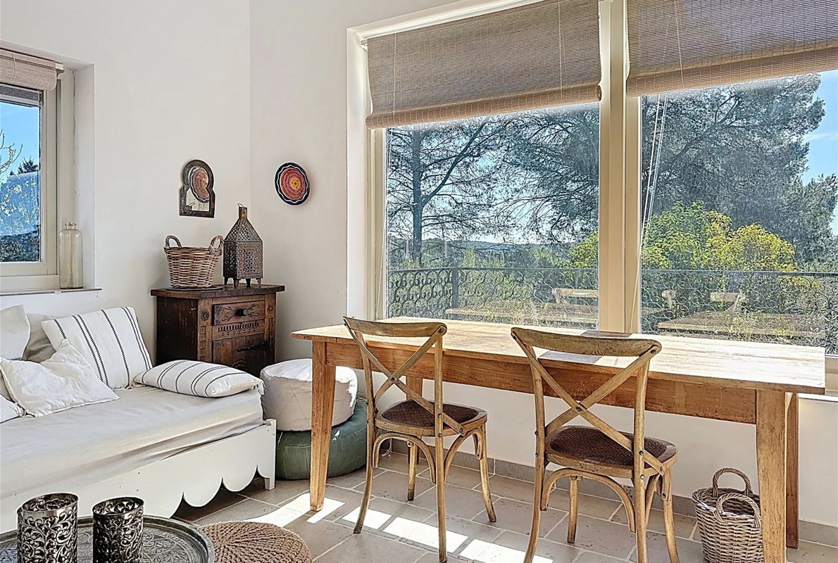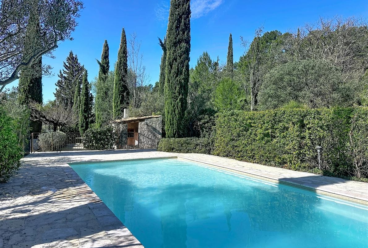 a few kilometers from the village, this charming villa offers breathtaking views. The house includes a kitchen and a bright, very nice living/dining area . The large master suite boasts a beautiful bathroom, separate toilet,. The other bedrooms are located on the opposite side of the living area: one bedroom with its own bathroom and two additional bedrooms, one of which has French doors opening onto the covered terrace. These bedrooms share a bathroom and a separate toilet. Beneath the entire house is a basement with a garage, ample storage space, and two additional bedrooms with windows and a bathroom. The surrounding garden is beautifully maintained with Mediterranean plants. The 11 x 5 meter pool is in excellent condition.