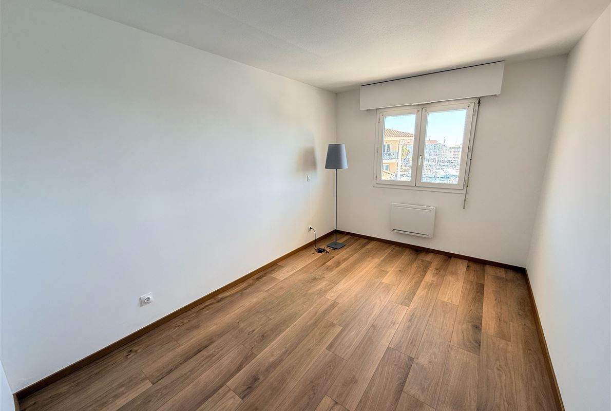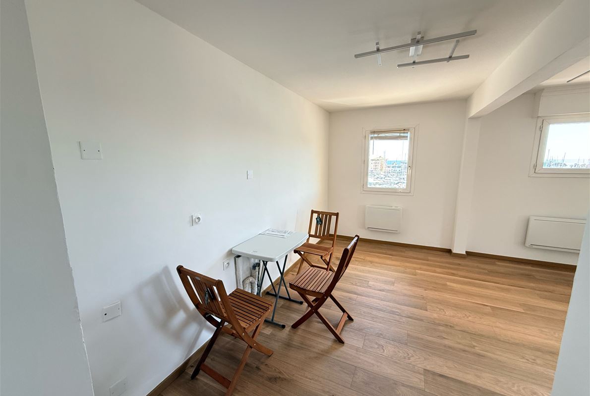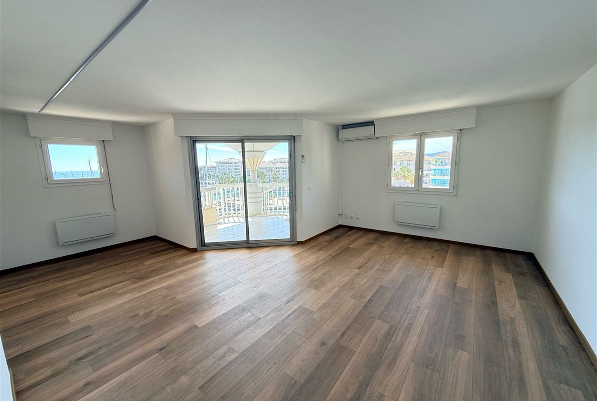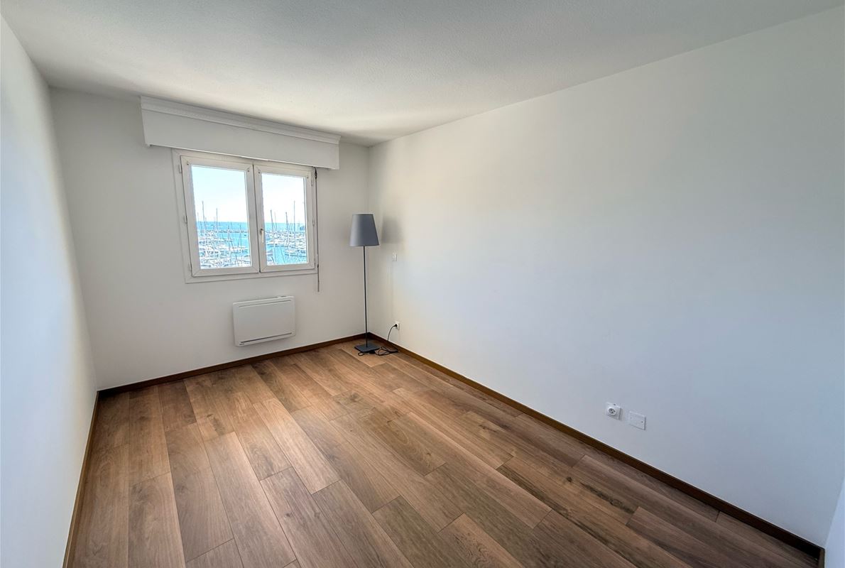 EXCEPTIONAL PORT VIEW for this 72m2 corner 2-bedroom apartment on the top floor (elevator) comprising an entrance hall with built-in wardrobe, a kitchen to be fitted and equipped opening onto the living room, a dressing room/pantry, two bedrooms, a shower room, and a separate WC. Terrace. Indoor parking.