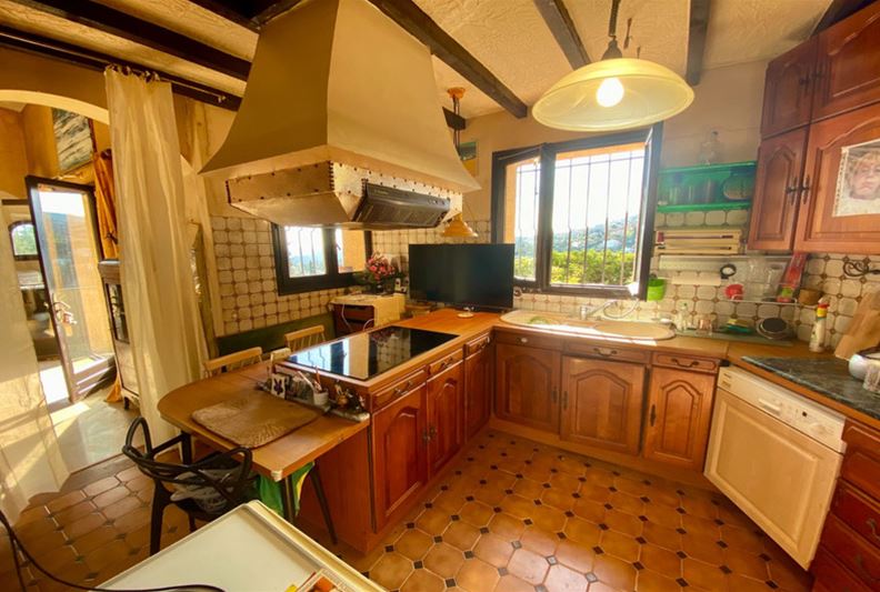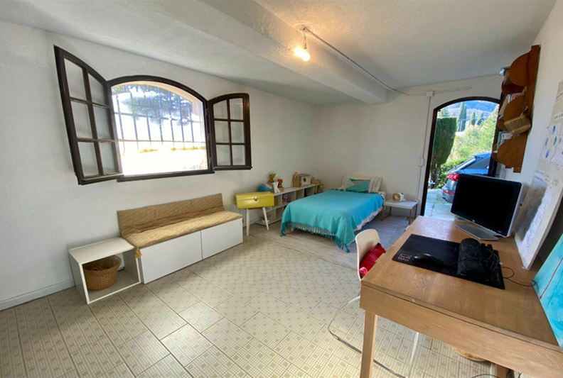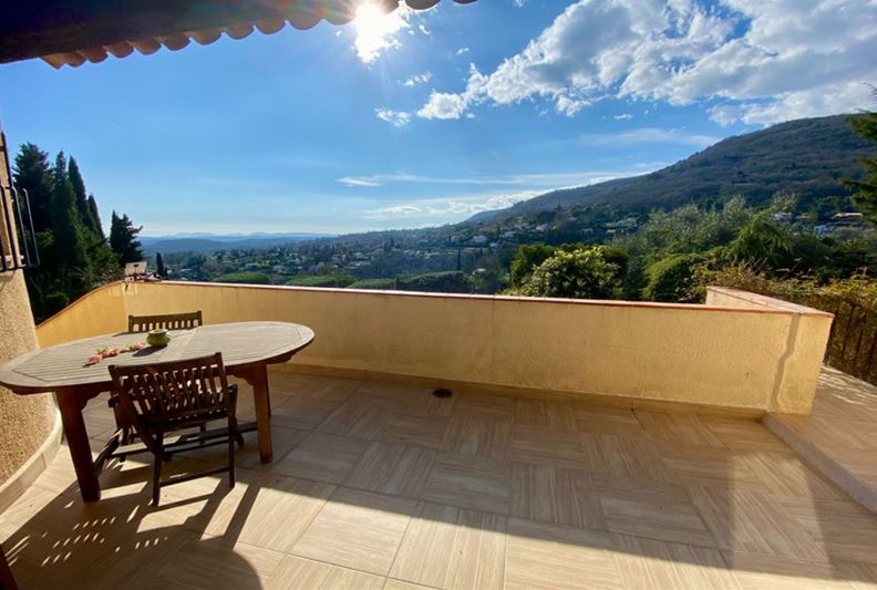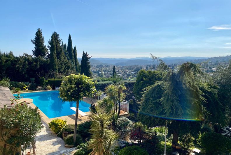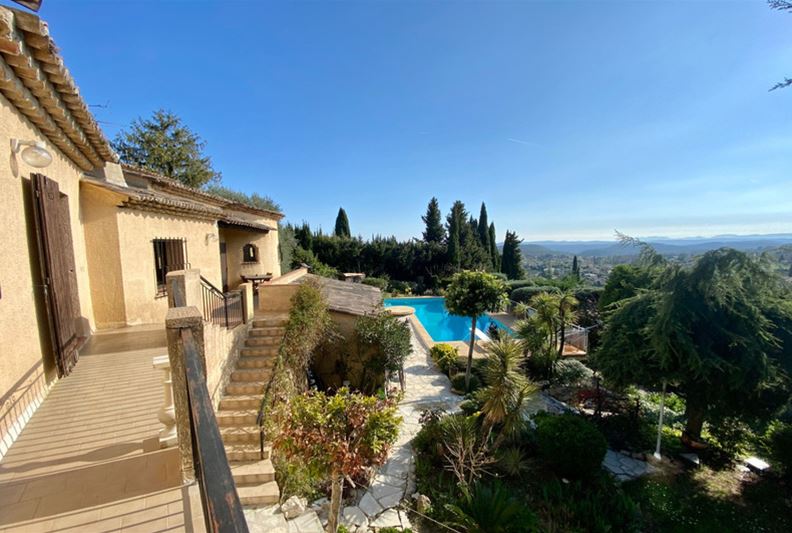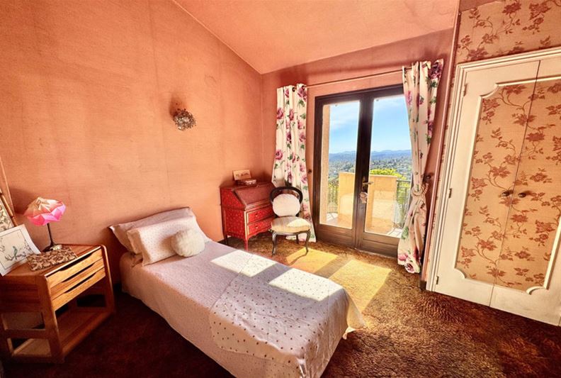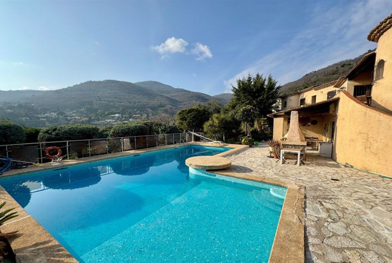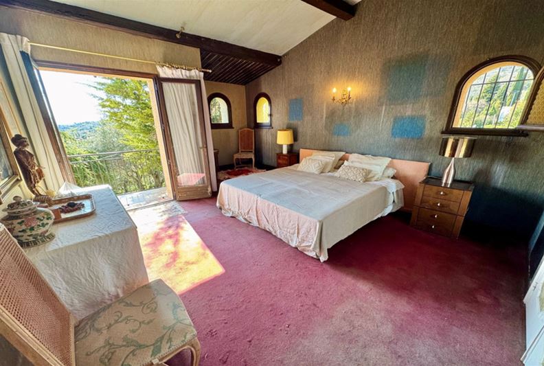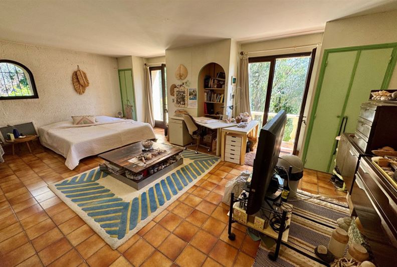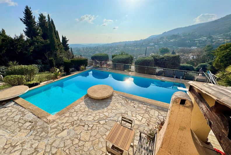 On the residential heights of VENCE, offering stunning views of the hills, the Estérel, and a glimpse of the sea, in absolute peace and full sunshine, featuring: entrance hall with closets and toilets, living room with fireplace, dining room, office, independent fitted kitchen opening onto a terrace, at a split level: on one side three bedrooms, bathroom/toilet, on the other, a large bedroom (4) with bathroom/toilet and kitchenette that can serve as an independent studio; on the lower garden level: bedroom (5), bathroom/toilet, two large rooms that could be converted into a playroom, gym or TV room. Large terrace, summer kitchen, generously sized pool with paved sunbathing area, large garage, parking spaces