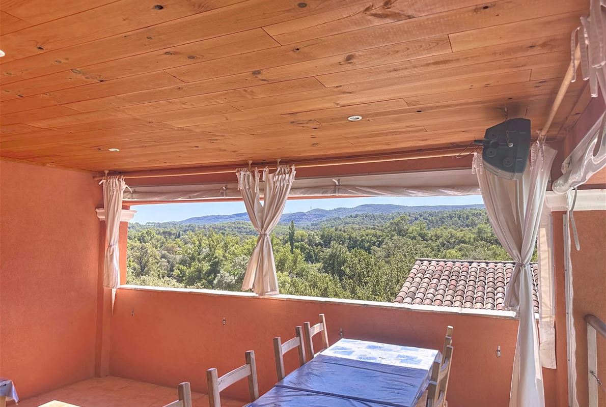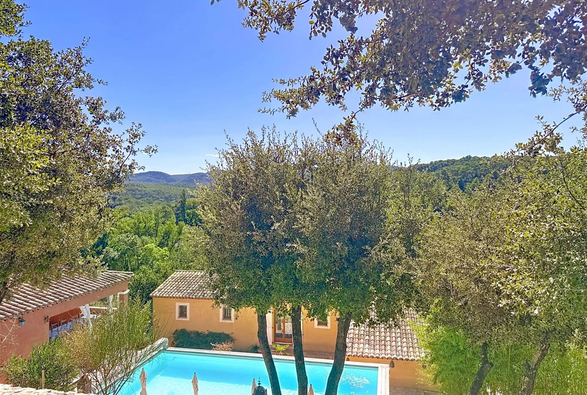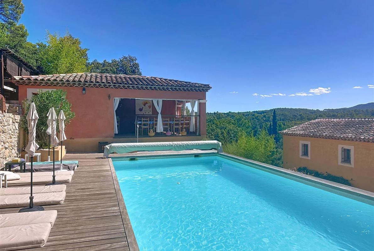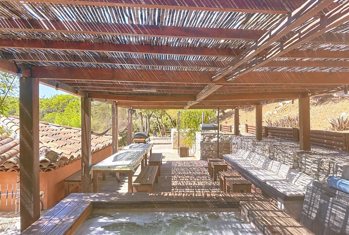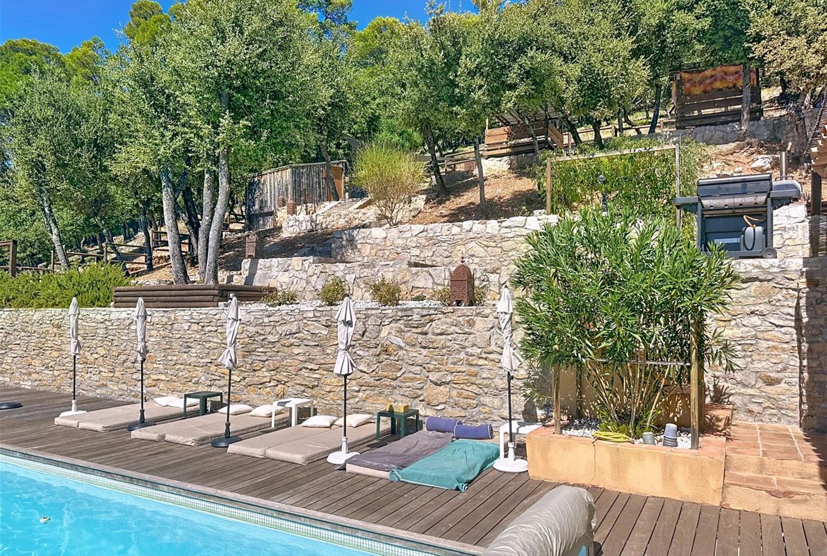 Just 5 km from thevillage of Lorgues. The property features an open kitchen and a bright living room that opens onto a large 70 m² terrace with stunning panoramic views. There are two comfortable bedrooms, each with its own private bathroom. In addition, there are four separate rooms with private bathrooms and private entrances, as well as two independent studios — perfect for quietly hosting family, friends, or other guests. A heated swimming pool (10 x 5 m) with sun terrace, pool house, and semi-professional outdoor kitchen Two jacuzzis, a sauna, and several relaxing seating areas scattered throughout the grounds A cozy room for relaxation or exercise Private access to the river with a pontoon and canoes