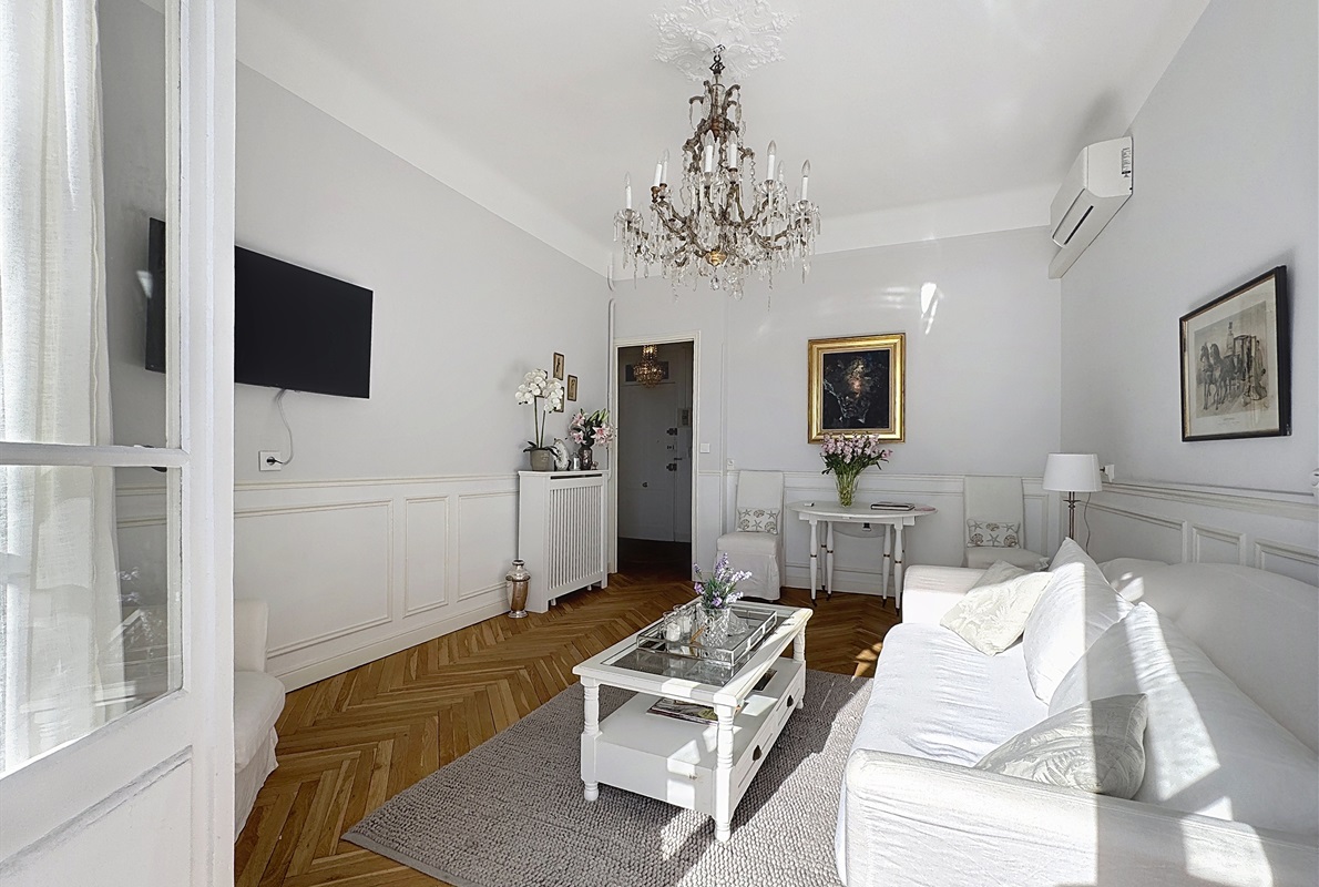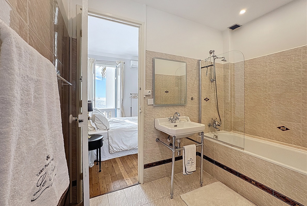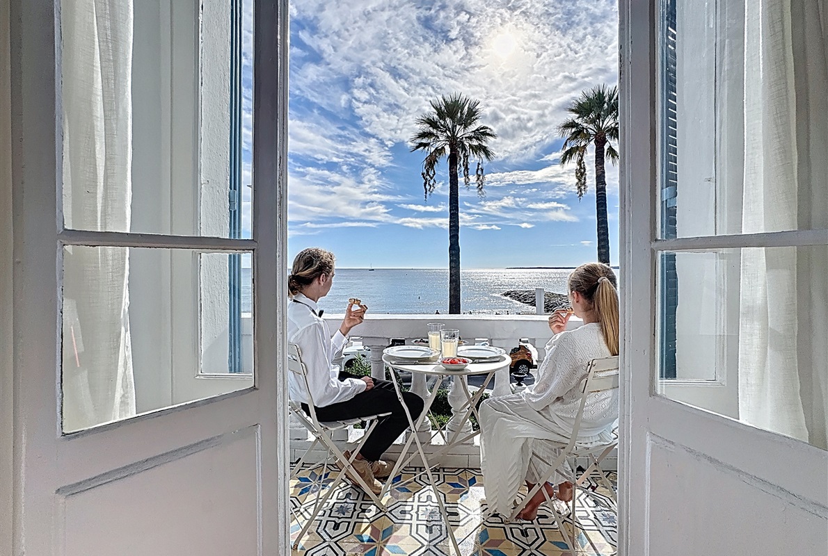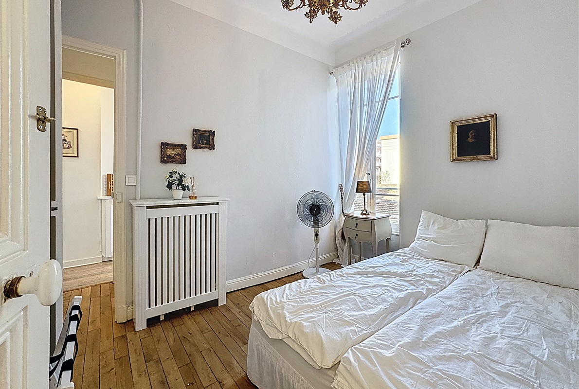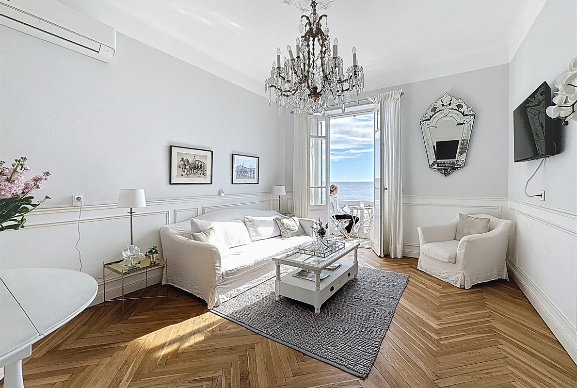 In the heart of the French Riviera, with direct views of the azure Mediterranean Sea, this unique and magnificent apartment is located on the watherfront in the attractive Juan les Pins. Classic elegance, high ceilings, beautiful panels and parquet floors, combined with modern comfort. Entrance hall with built-in wardrobe, toilet, kitchen, 2 bedrooms (one with sea view) each with access to the bathroom, sunny living room with access to a balcony, where you can enjoy the sun rises over Cap d’Antibes or the sun sets behind the Esterel mountains. Maid's room on the attic with access to a toilet. Large basement room. Located just a few steps from cafes, restaurants and shops, this residence combines the luxury of the Riviera with authentic French charm.