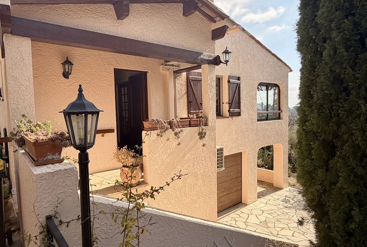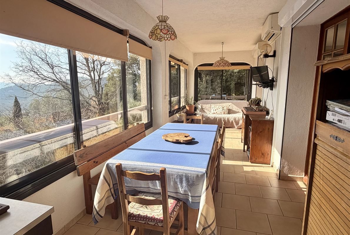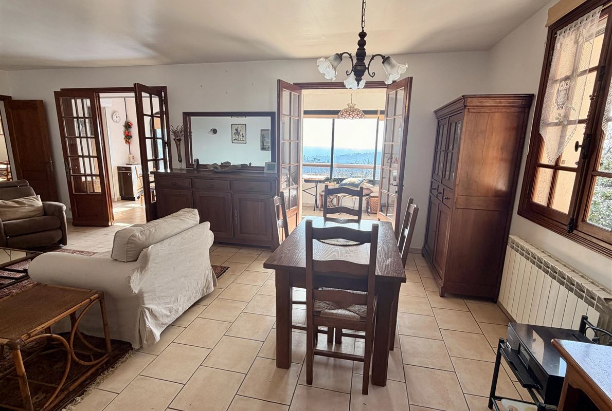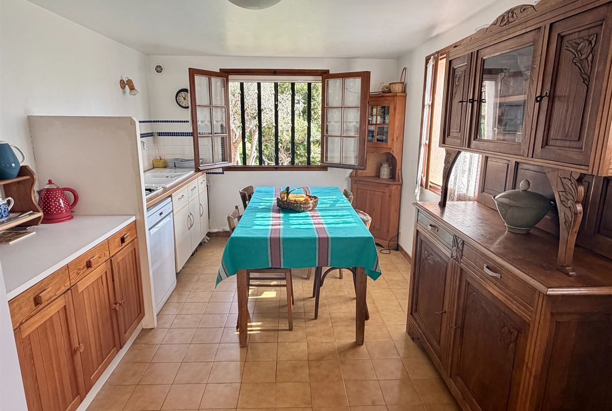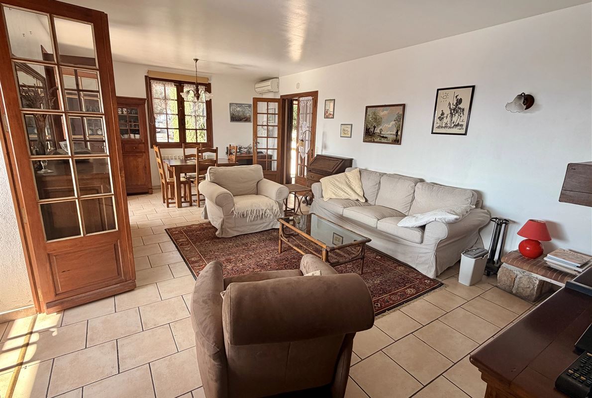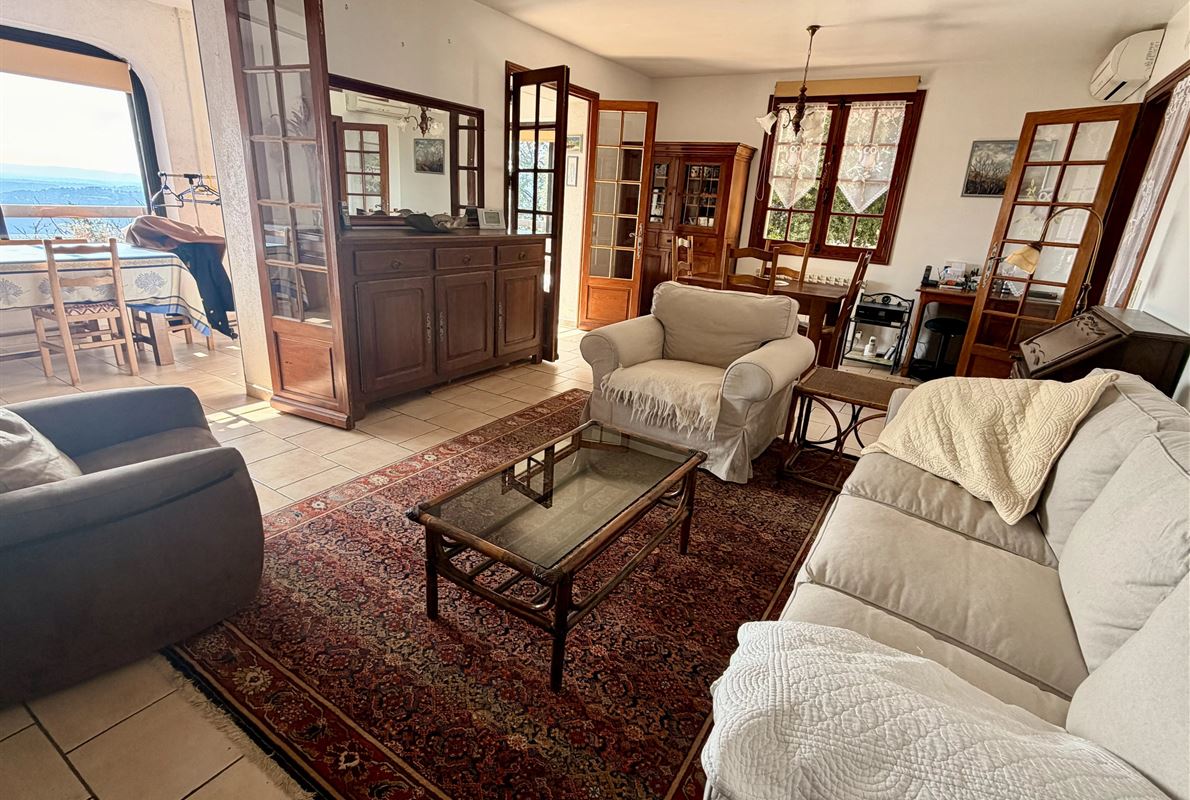 villa built in 1982, on enclosed and landscaped plot. Ideally located on elevated ground, the property enjoys a beautiful unobstructed view over the surrounding area while being within walking distance of the village, restaurants, and shops. The main villa comprises: Ground floor: Porch and entrance hall Guest WC with dressing area Spacious living room with fireplace insert, opening onto a pleasant veranda Fully equipped kitchen Two bedrooms with built-in wardrobes Dressing room Shower room with WC Garden level: An independent apartment including: Living room with open-plan kitchen, opening onto a covered terrace Two bedrooms Shower room with WC Adjoining this space: Garage with automatic door Cellar Laundry room