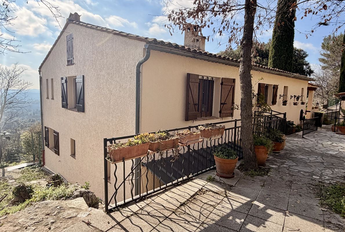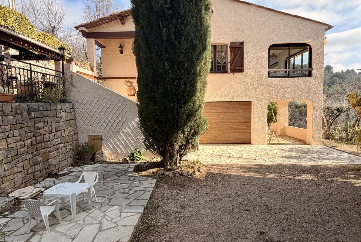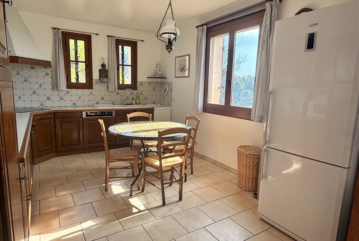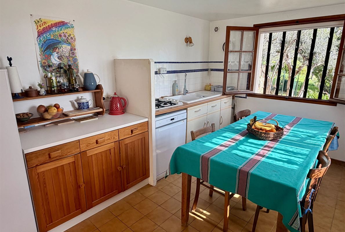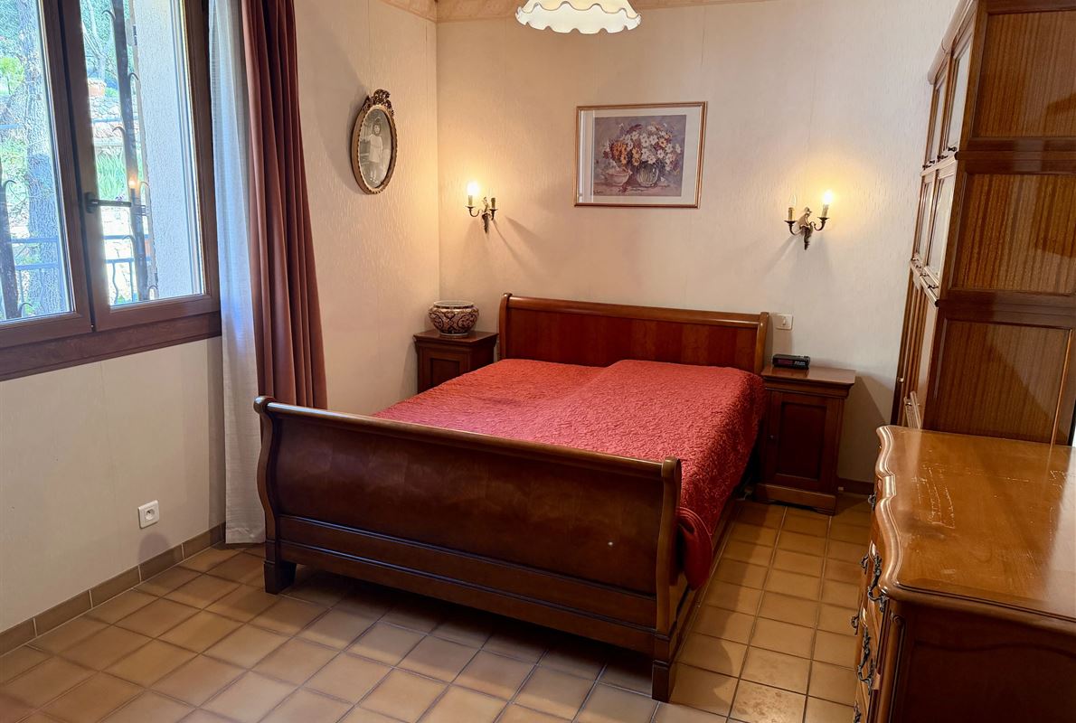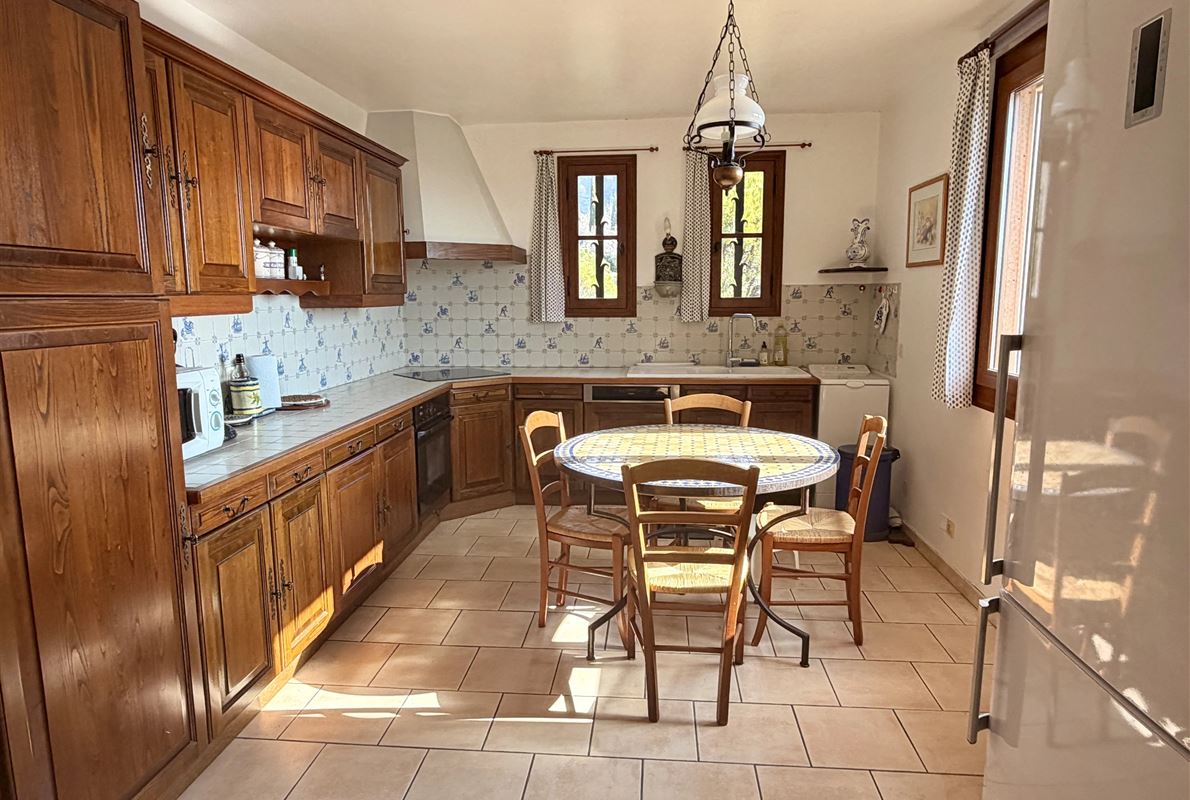 villa built in 1982, on enclosed and landscaped plot. Ideally located on elevated ground, the property enjoys a beautiful unobstructed view over the surrounding area while being within walking distance of the village, restaurants, and shops. The main villa comprises: Ground floor: Porch and entrance hall Guest WC with dressing area Spacious living room with fireplace insert, opening onto a pleasant veranda Fully equipped kitchen Two bedrooms with built-in wardrobes Dressing room Shower room with WC Garden level: An independent apartment including: Living room with open-plan kitchen, opening onto a covered terrace Two bedrooms Shower room with WC Adjoining this space: Garage with automatic door Cellar Laundry room