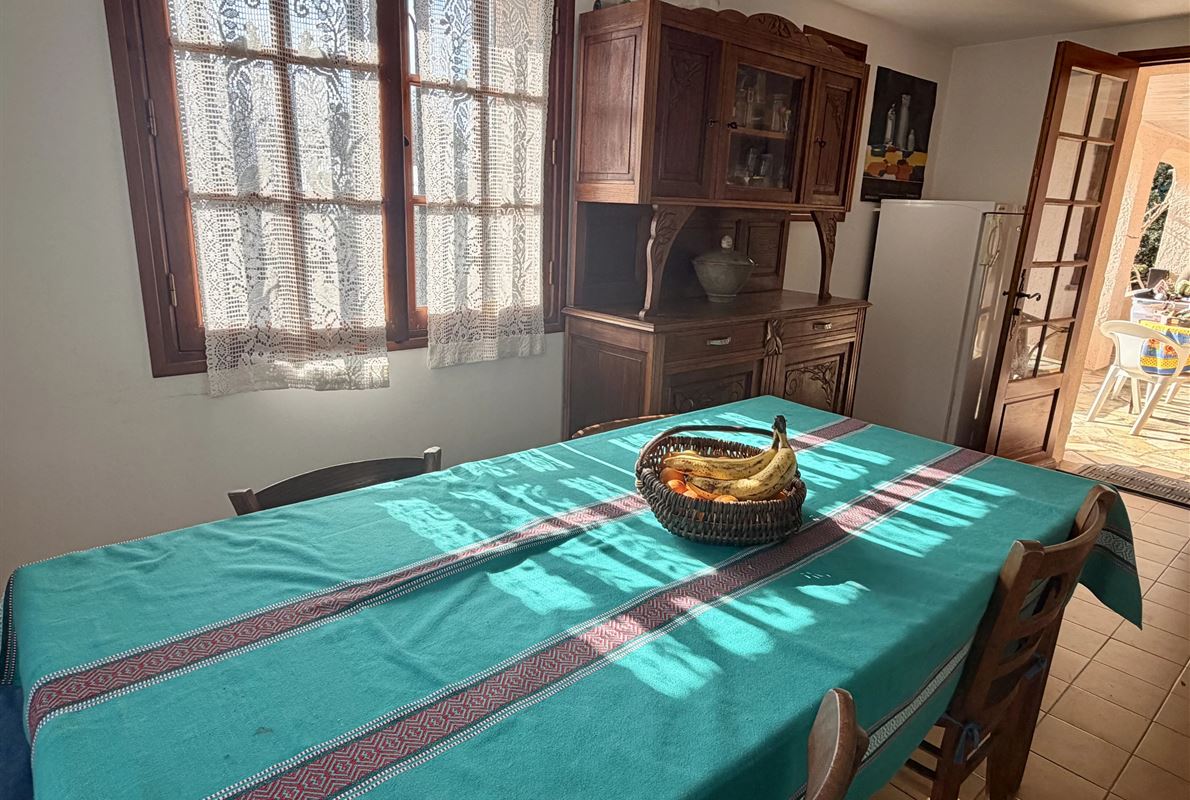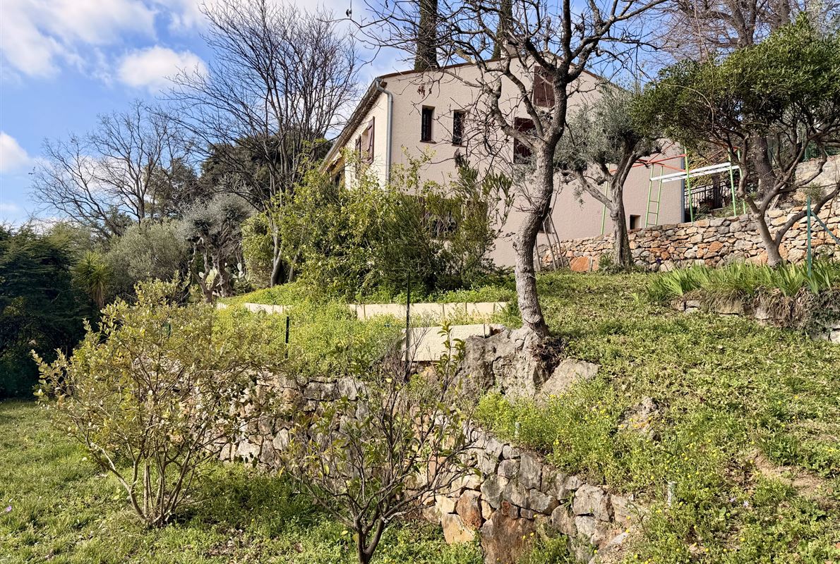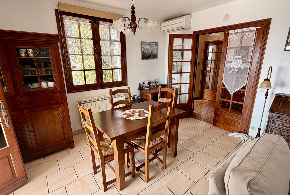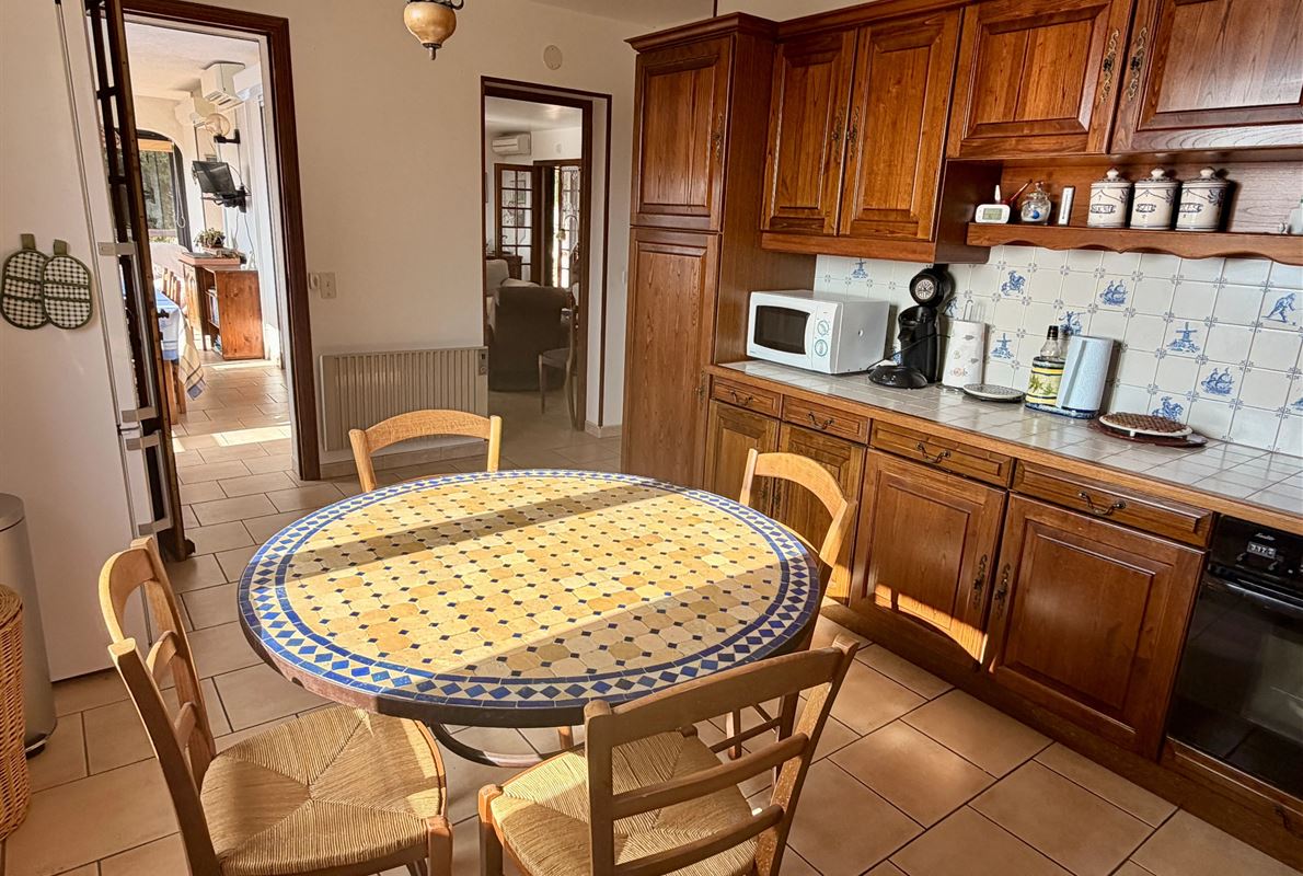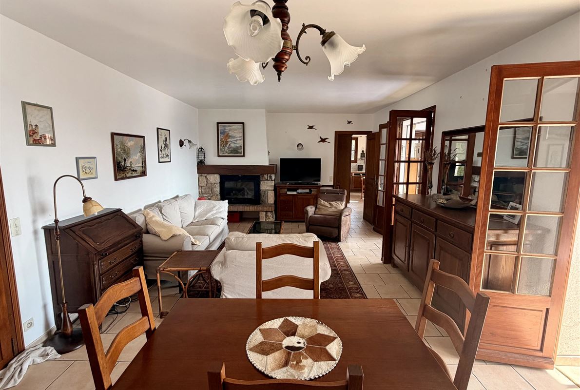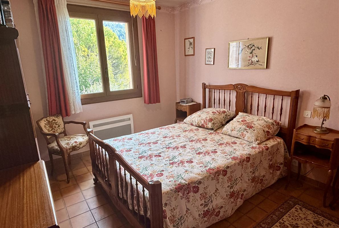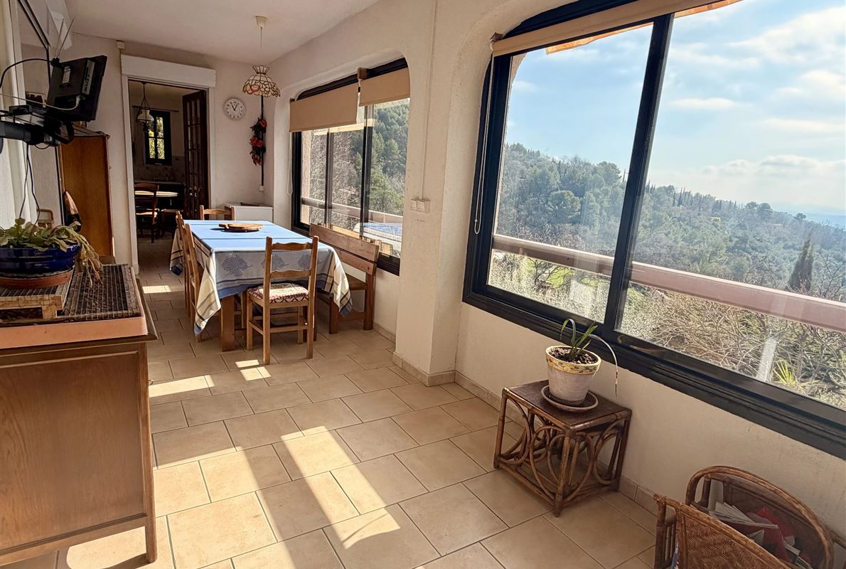 villa built in 1982, on enclosed and landscaped plot. Ideally located on elevated ground, the property enjoys a beautiful unobstructed view over the surrounding area while being within walking distance of the village, restaurants, and shops. The main villa comprises: Ground floor: Porch and entrance hall Guest WC with dressing area Spacious living room with fireplace insert, opening onto a pleasant veranda Fully equipped kitchen Two bedrooms with built-in wardrobes Dressing room Shower room with WC Garden level: An independent apartment including: Living room with open-plan kitchen, opening onto a covered terrace Two bedrooms Shower room with WC Adjoining this space: Garage with automatic door Cellar Laundry room