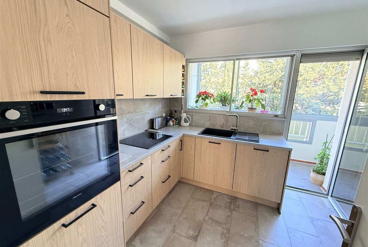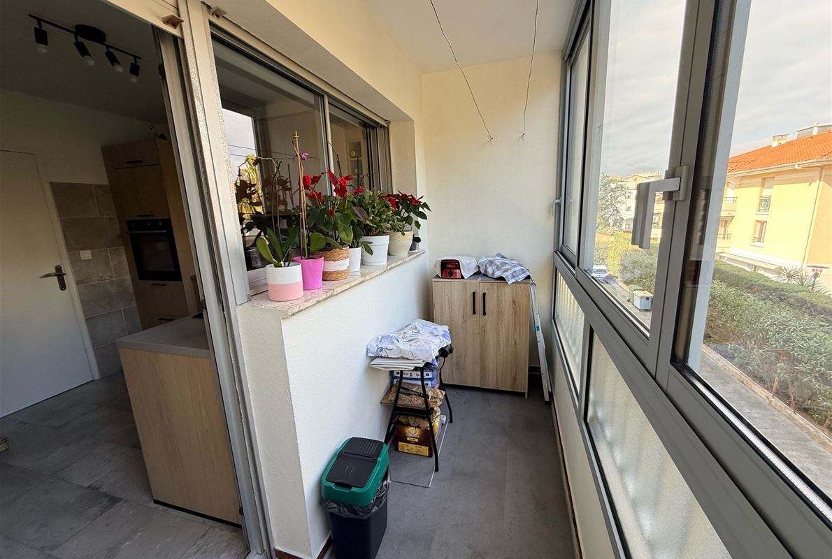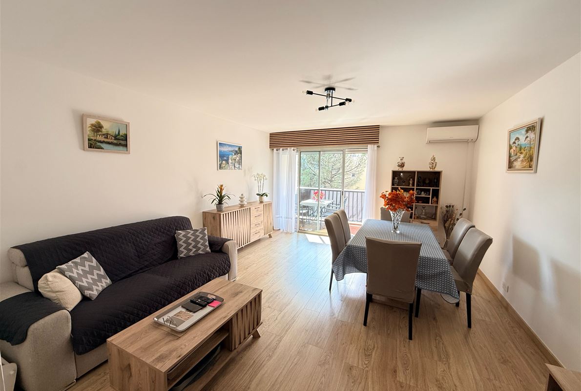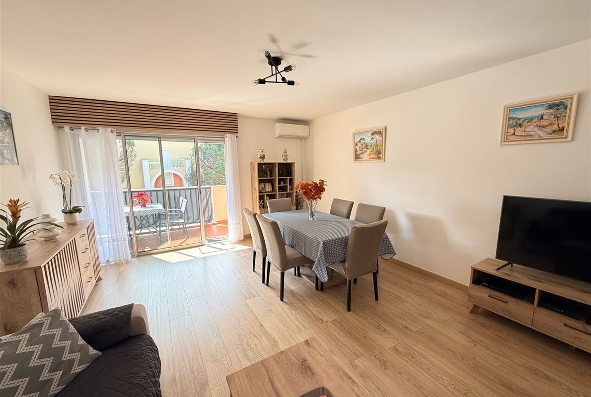 n a small residence in Port Fréjus, a 3-room apartment of approximately 72m2 comprising an entrance hall with built-in wardrobe, a fitted kitchen opening onto a loggia, a living room opening onto a terrace, two bedrooms, a shower room, and a separate WC. Private parking space. Garage.